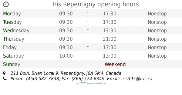It is also possible to : Edit these OPENING HOURS of Store Iris In Repentigny, 211 Boul. Brien Local 9,